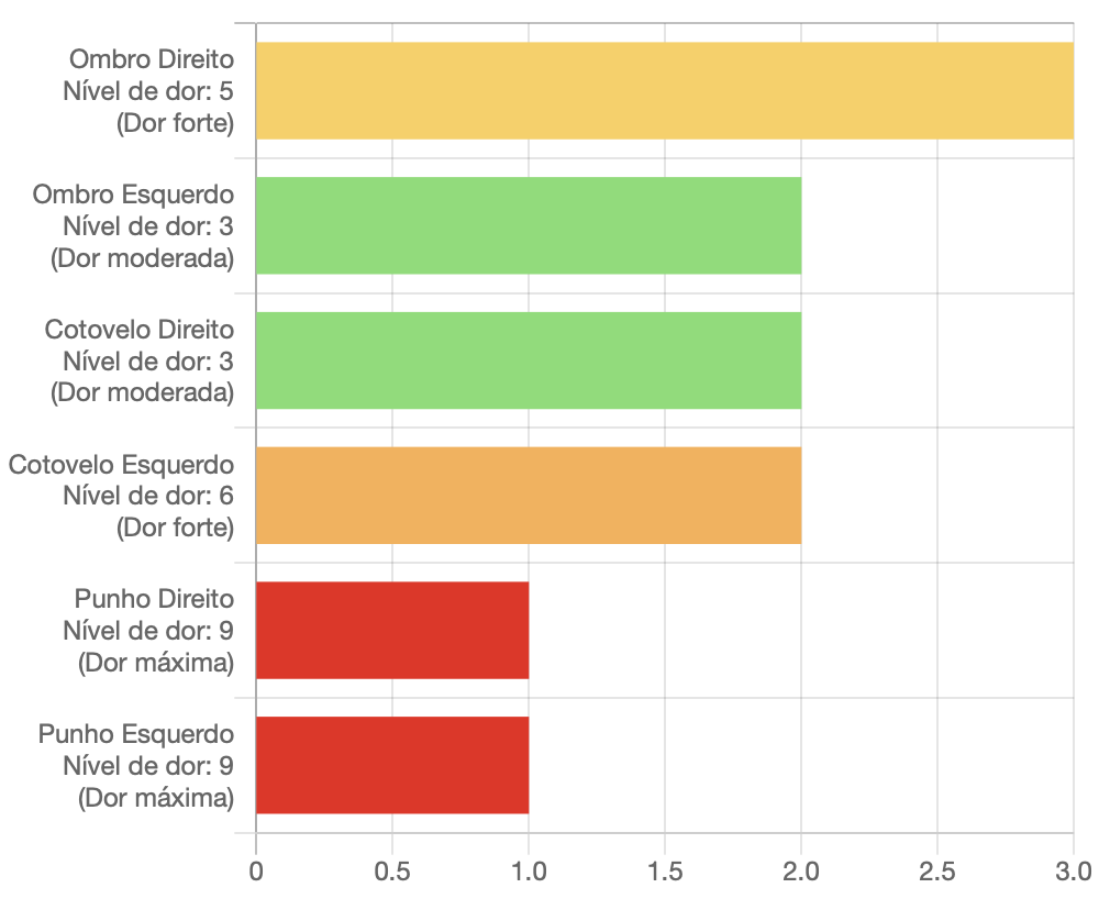 Após acessar, você poderá identificar a articulação e o nível de dor. Nós organizaremos essas informações em gráficos, permitindo que você analise quais articulações mais doeram, ou qual foi o seu nível de dor, por exemplo.